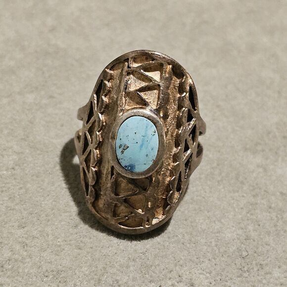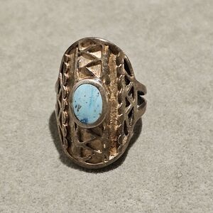 Old Pawn c.1950s Navajo Sterling Silver Ring w/ Turquoise Size 5.5, 6.8 grams. Ring is in good condition and has not been cleaned. Sold as shown in photos. Any questions please let me know. Thanks for looking.