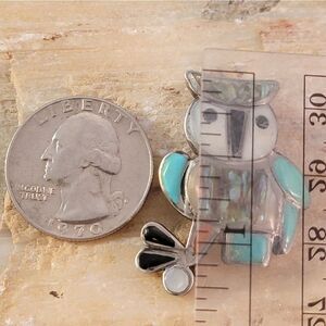 Old Pawn Zuni Sterling Owl Turquoise MOP Abalone Red Coral Brooch Pin
