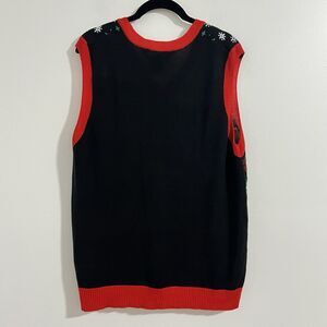 The vest features a V-neckline, making it suitable for casual occasions and winter seasons. The black and red color with Christmas theme give it a festive and fun look, perfect for beer pong or other holiday gatherings.