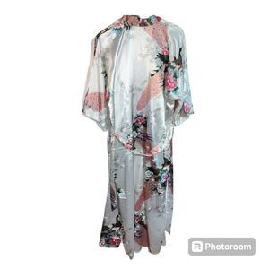 Old Shanghai Asian Belted Robe Women’s OSFM White Pink Peacock Design Kimono