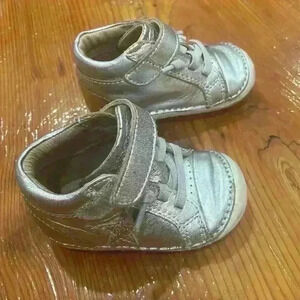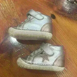 Old Soles Australia silver and rose gold 6-9 months US 3 baby sneaker shoes. Preowned with some signs of wear as shown in the pictures.