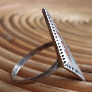 A beautiful older silver Zuni ring with chip inlay of turquoise and coral. This has some heavy wear and scratching to the band, it is also a bit out of circle so hard to size accurately, I would say it will probably accommodate sizes 5 - 5.25 US. I feel like this may be marked, but it is hard to know if that's just tarnish or scratching. The condition issues mentioned just give this patina, they don't affect the comfort of wearing this. Measured at front just over 1" high x about 0.6" wide.