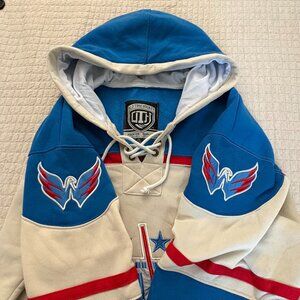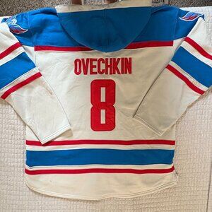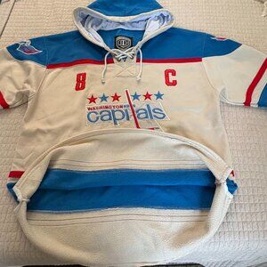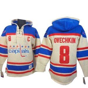 Old Time Hockey Authentic Cream Sawyer Hooded Sweatshirt Jersey Alex Ovechkin # 8 Washington Capitals Hockey. Great nostalgic fan find! Two small spots pictured but otherwise in great condition. Perfect for anybody and the oversized lover at size 2XL