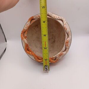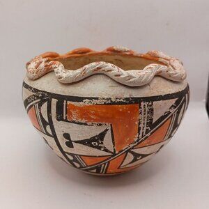 This vintage pottery bowl tells a story through its intricate hand-painted geometric patterns and textured rim. The vibrant orange and earthy tones evoke a sense of ancient tribal artistry, making it an evocative piece that adds a touch of cultural heritage to any space.