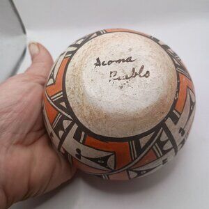 Rare pottery from the 1940s.. Signed "Acoma Pueblo" No cracks or large chips. A couple small scuffs/nicks. Color loss on about half of the bowl, as shown in photos. Please look closely at photos for full condition details. Measures 3" tall and 4 1/2" across.