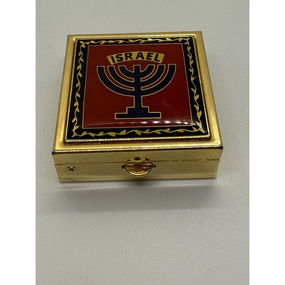 Vintage souvenir pill or trinket box Israel, goldtone metal, menorah image on the lid, travel souvenir.