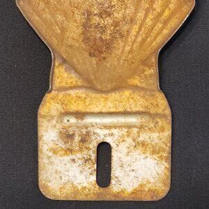 The product is an old vintage license plate topper featuring the Shell Oil Gas logo, designed for cars, autos, and hot rods. Made in the United States, this emblem badge is a collectible item for those interested in automotive memorabilia and vintage transportation accessories. Perfect for adding a retro touch to a classic vehicle or displaying as a unique decorative piece for enthusiasts of automotive history.