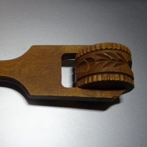 Old Vintage Wood Springerle Cookie Roller Pineapple Made in US Zone Germany. Excellent vintage condition. Two very tiny marks between roller and handle, look like very small knife points. One very small crack on edge of roller from the middle of the pinapple mold to the edge of roller, ends before serrated edge does not look like it extends down the edge of roller. One very small chip/ding at end of handle where it holds the roller. See close up pictures with areas marked. Tool is 9 1/4" long x 2 3/8" wide, roller approximately 2" in diameter. Weight 5oz. Worth Point and other sites say that things marked “Germany US Zone” means the piece was made at the end of World War II between 1945 and 1949, when the marks changed to read “Made in West Germany,” “W.Germany,” or “Western Germany. A buyer that returned it said it could not have been made then because of its excellent condition. But it was clearly made then. Interested, make an offer. From a smoke and pet hair free home. Fast, careful shipping.