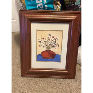 Old Vtg WATERCOLOR Art PAINTING ? FLORAL POT Wood Framed WALL HANGING 17”x20”