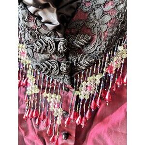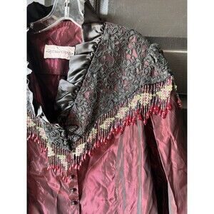 Beautiful ornate, detailed taffeta blouse or jacket from recollections. Note all the details such as a ruffle neck, lace yoke, beaded fringe, and black pearl buttons. See photos for complete details and dimensions