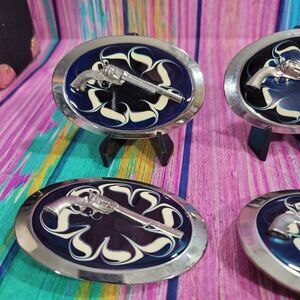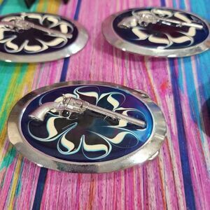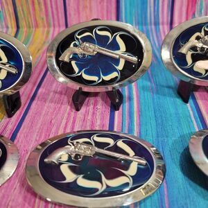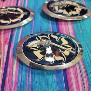 This listing is for one Vintage, Brand New Stock, Epoxy Belt Buckle from my grandparent's store. This epoxy belt buckle features blue swirls showcasing an old west revolver. There may be fingerprints or storage wrap marks on the metal or epoxy, these can easily be wiped/buffed/polished out.