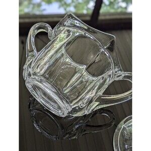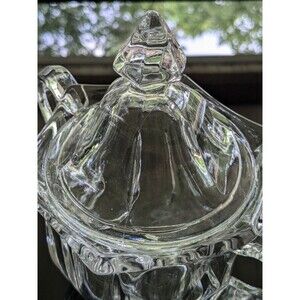 The sugar bowl comes with a lid and is made by Imperial Glass of Ohio. It is perfect for serving guests or for everyday use. The clear glass allows for easy visibility of the contents, while the double handle makes it easy to pour. Add this beautiful piece to your collection today!