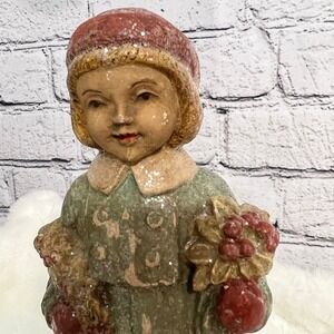 Adorable old world Christmas boy (or girl) holding poinsettia and a wreath.