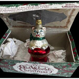 Charming blown glass ornament by Old World Christmas featuring a white kitten peeking out of a red Christmas boot, accented with green glitter scarf and gold trim. Hand-painted, mouth-blown, and topped with the signature OWC gold star hanger. Retired design. Comes in original box (window torn). Ing Glass Germany