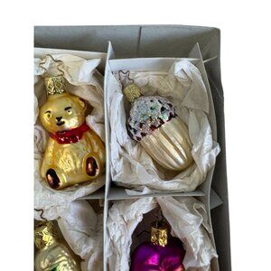 Beautiful boxed set of 13 Old World Christmas small/mini blown glass ornaments, each with the signature gold star crown cap. Includes a fun mix of holiday and whimsical designs such as a teddy bear, pickle, cupcake, bell, owl, fruit, and more. Perfect for tabletop trees, feather trees, or adding to your OWC collection.