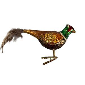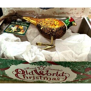 This is a hand-blown glass pheasant bird ornament from Old World Christmas. It features a glittered golden-brown body, green head with red details, and a real feather tail. The ornament has a gold clip for secure placement on a branch. Best of all, it comes complete with the original hang tag and storage box, making it a wonderful addition to any Old World Christmas collection. 2003