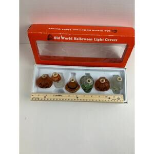 Vintage Old World Halloween light covers set (6 pieces) housed in original box. These hand-painted glass covers fit over small lights (string / bulb) and include classic Halloween figures — pumpkins, ghost, witch, skull, etc. The covers appear intact and the box remains, though with wear consistent with age.
