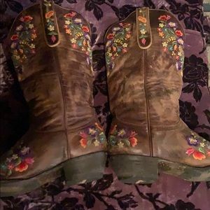 Beautiful floral embroidery very bright and vivid details brown leather small heel a very comfortable beautiful accessory as it can go with anything day or night