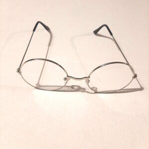 Halloween costume for being an old lady with wig caps, curly short grey wig, glasses with chain and faux pearl necklace.