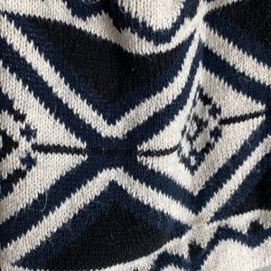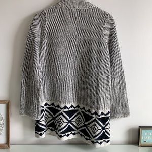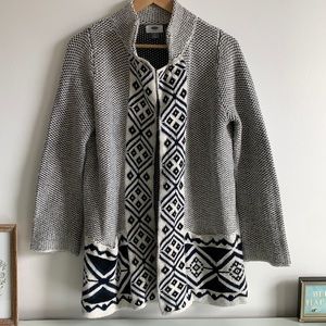 This is a longer sweater with a structured cardigan cut. Light to medium weight, very cozy but does have a bit of structure. Pockets in front. The length goes to fingertips at sides. Soft, not itchy with bare arms. Cotton and acrylic