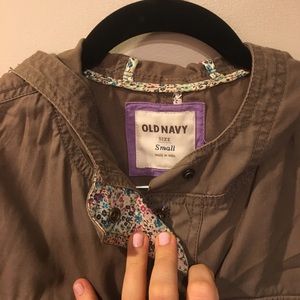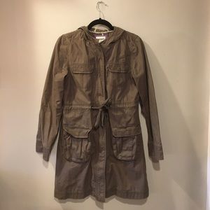 Light cargo jacket with waist tie. Zips up and buttons at top and bottom. Has a hood too