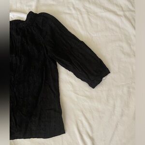 Shiny silver stripes in the detail and a unique neck line with also unique sleeve style almost cuffed looking ends