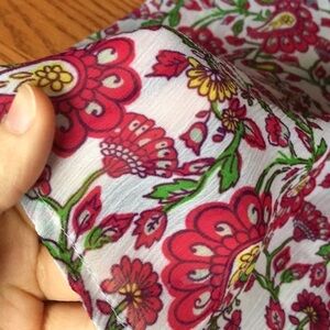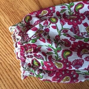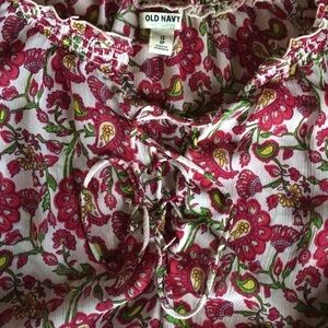 This sheer paisley printed blouse has a lace up front, puffy sleeves, and a smocked neckline.