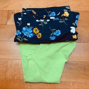 Navy blue background with blue, gold and orange flowers. Beautiful vibrant colors. FREE Green leggings included with purchase!