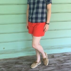 These 5in inseam orange linen shorts have functioning front pockets and faux back pockets. Very comfortable.