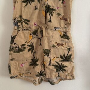 Stylish sleeveless romper with a tropical print. Features palm trees and wildlife designs. Perfect for a casual day out.