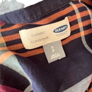 Old Navy Classic plaid button front shirt, lightweight, 100% cotton, size S. Navy blue with pink, orange, green. Button cuffs, chest pocket. Approximate measurements are pit to pit 19”, length from shoulder approximately 25”.