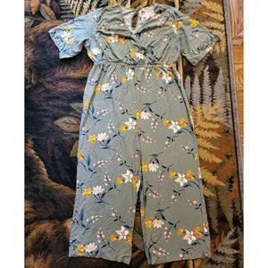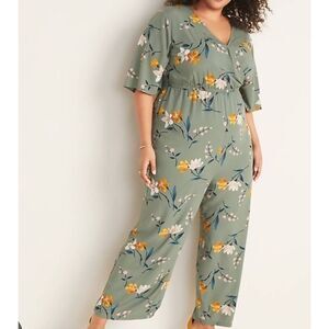 Old Navy Jumpsuit Women's 1X Green Floral Wrap Front Bell Sleeve Wide Leg
