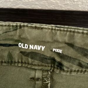 Old Navy pixie pants in a tropical green camo design.