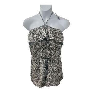 This Old Navy romper is a stylish and versatile jumpsuit in a size L, made from a linen blend fabric in a white color with black accents. The strapless design and drawstring waist give it a boho chic look, perfect for various occasions such as travel, parties, or casual outings. It features a sleeveless style, straight leg fit, and convenient pockets, making it a comfortable and fashionable choice for the summer, fall, or spring seasons. The animal print pattern adds a trendy touch to this one-piece romper from Old Navy.