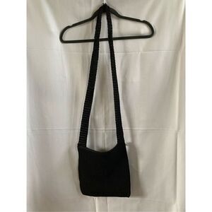 Black, woven material, medium size crossbody, shoulder, handbag, purse, extra long strap, can tie to shorten