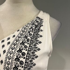 Elegant sleeveless dress with intricate black patterns on a white base. Perfect for casual outings or special occasions.