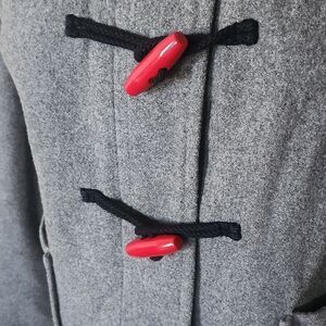 Pretty gray hooded coat with plaid accent, and red toggle over hidden zipper closure. Two front pockets, measures 21" pit to pit, and 24" in length. C2.9221