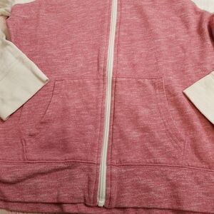 Old Navy jacket with hood L10/12 . Pink with cream sleeves. EUC. 17x20 (pit to pit and shoulder down to hem).