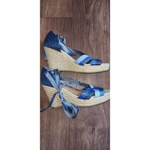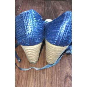 Multi colored blue peeptoe wedge sandals with ribbon laces. Textured straw and hemp rope design