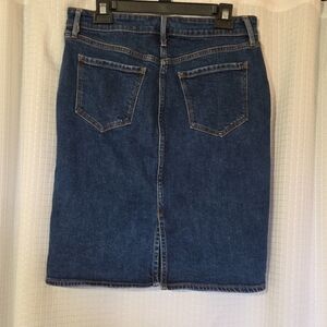 The product is an Old Navy knee-length denim skirt in size 10 with a high rise waist. This classic blue skirt features a solid pattern, zip closure, and is made of a blend of spandex and cotton for stretch and comfort. Suitable for casual and workwear occasions, it also has a slit, pockets, and is machine washable. The skirt is perfect for the summer, fall, and spring seasons, adding a versatile and stylish option to any woman's wardrobe.