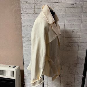 Very good condition. Heavy duty coat with good weight to it. Color is somewhere between an off white and a very very pale yellow. Detachable belt. One area of discoloration on the belt as noted in the picture. One small thread pull on shoulder as noted in picture. No holes, rips, or stains.