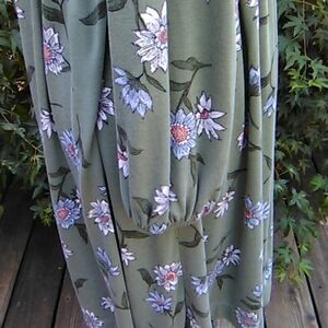 So very soft and comfortable. Soft sage with daisies sprinkled over. Pull over style, long sleeves with elastc at bottom for a gathered look. Top lined. Size M measures 37 at chest, 32 under chest. There is stretch. Full skirt. 37 long from shoulder to hem. You will live in this one.