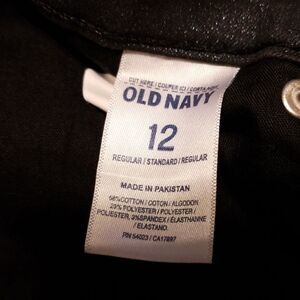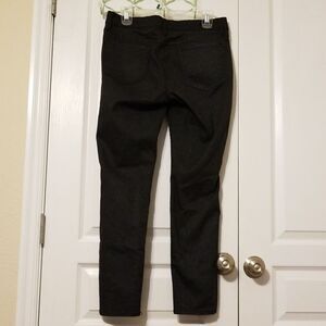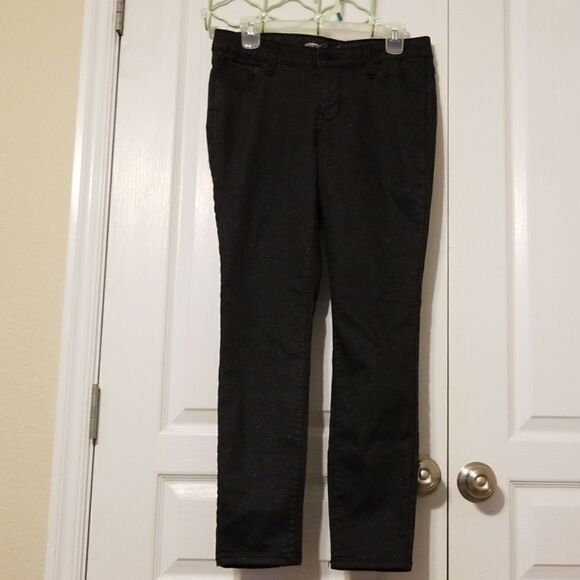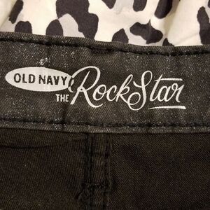 Black Jeans with glitter on them with pockets on the front and back. The style is rockstar.