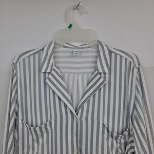 Gray and white striped, size large. Pretty button front Blouse with 2 breast pockets and long sleeves. Side slits. Measures 23" pit to pit, length is 29". Retail $35