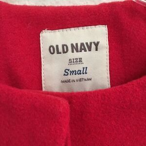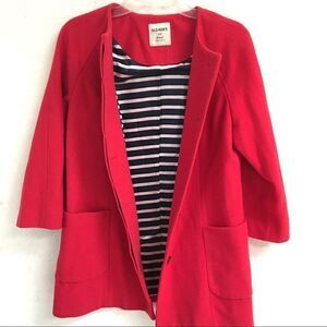 2 front pockets,slightly cropped sleeves, lined in navy & white stripes, in a pretty pinky poppy red color