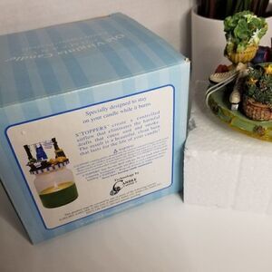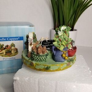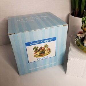 Adorable candle capper, poinseitta scene, lovely detail on figurines, stay on candle while it burns, reduce ugly black built-up in the jar, create a beutiful clean burn, fit all standard jar candles. New in box only taken out for photos. NWOT