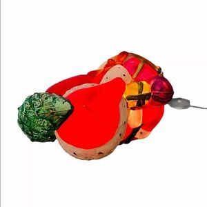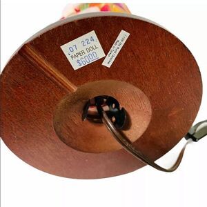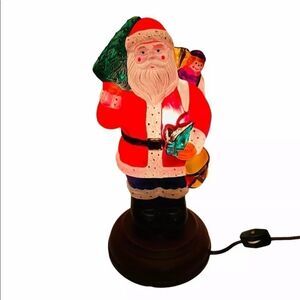 Vintage Patriotic Santa Clause light model #529733, 1996. It features Santa Claus holding a small tree over his shoulder in one hand, and a drum and bugle in the other hand, plus a doll with a USA flag, with a red and white and navy robe. The approximate diameter of the circular base is 5-3/8", and the light stands about 11-1/4" high.