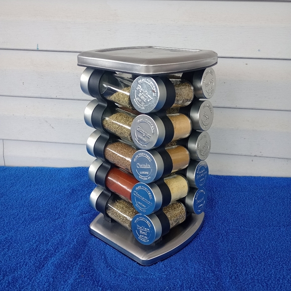 Organize your spices with this Olde Thompson Rotating Carrousel Spice Rack. The rack features 20 round glass jars with flip lids, neatly arranged on five tiers. The stainless steel rack type adds a touch of silver to your kitchen decor.