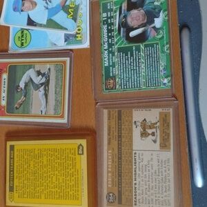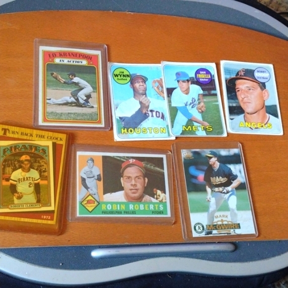 '68 Dan Frisella#343&'68 Jim Wynn#360&'68 Bobby Knoop#445(these 3 are in good condition,has a few corner creases)&'74 Ed Kranepool in near mint condition &'95 Mark McGwire in excellent condition & early 60's Robin Roberts, near mint & Roberto Clemente '87 mint shipped in protective sleeves