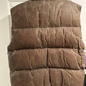 OlderBrother waxed puffer vest in mushroom brown (unisex large). Hand beeswaxed organic Japanese broadcloth and mother of pearl snaps. This style is hard to find and almost completely sold out on their website. Excellent condition with some patina. Runs large so check the measurements!